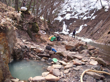 川の畔、誰かが掘って作った手作り温泉。